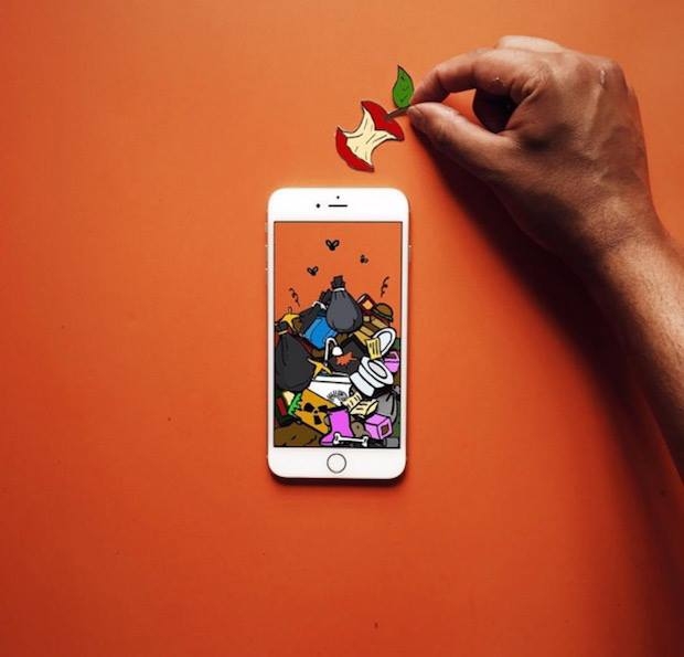 Bu teknikle oluşturulan çalışmalarda kağıt bir sınır değil ve illüstrasyonun tamamlayıcı çerçevesi bir iPhone ekranı.