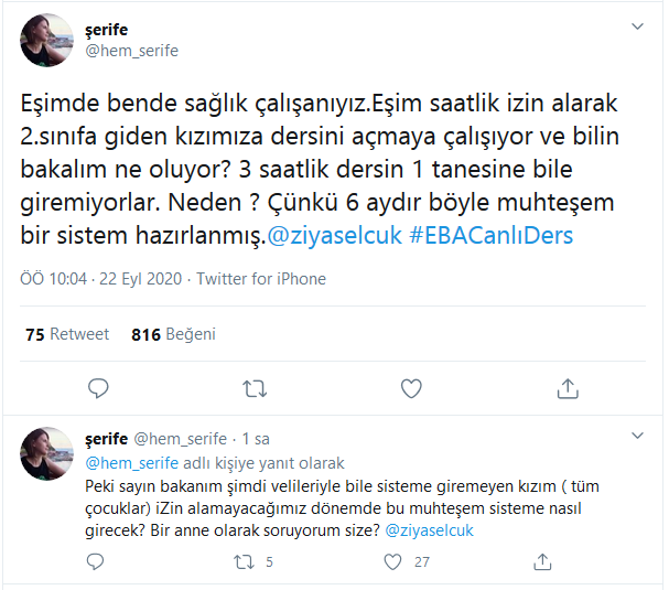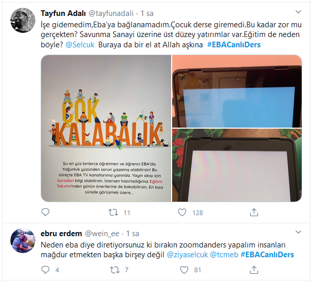 Bu duruma bir çok öğretmen, öğrenci ve veli isyan etti. Sisteme girebilen de oldu EBA.gov.tr'yi hiç açamayan da oldu. İşinden izin alıp çocuğunun eğitim almasını isteyen veliler de sisteme giriş yapamaktan isyan etti. Şimdi sizlere bir kaç tweet göstermek istiyoruz.